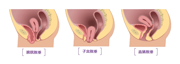 盆腔器官脱垂主要分为:膀胱膨出(阴道前壁脱垂)、子宫脱垂、直肠膨出(阴道后壁脱垂)。